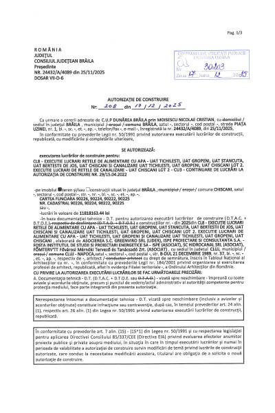 Autorizatia de construire nr. 26/28.03.2025 pentru „CL2 Proiectare si executie aductiuni apa potabila, retea evacuare ape uzate conventional curate din STAP Chiscani si aductiune apa bruta de la captare la STAP Chiscani – UAT Braila – Lot 2 Lucrari in STAP Chiscani, GA Braila, Complex inmagazinare Radu Negru si aductiune STAP Chiscani – STAP Gropeni