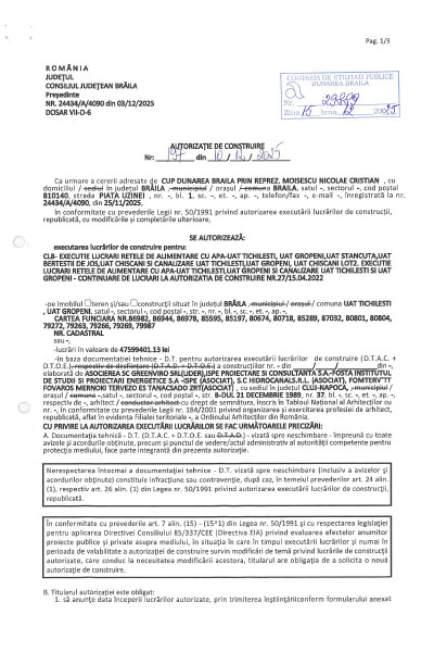 Autorizatia de construire nr. 18/27.02.2025 pentru „CL3 – Proiectare si executie extindere SEAU Braila – Introducere treaptă terțiară si SEAU Braila – Instalatie de uscare, neutralizare si valorificare termica a namolului Braila.